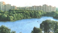 Вид на Комсомольское озеро и жилой массив проспекта Машерова в центре Минска.