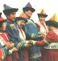 Летом буряты носили рубаху и халат из шелковых тканей, в дождливую погоду надевали сабу — суконную шинель с пелериной. Зимнюю одежду в виде халата чаще всего шили из овчины, а бедняки — из шкур телят и жеребят. Шапки с бархатным околышем непременно украшались пунцовой шелковой кистью наверху. Женщины втыкали в волосы за ушами две палочки, обшитые материей, к которым по праздникам подвешивался целый ряд цепочек с серебряными подвесками, которые развешивали и на груди.